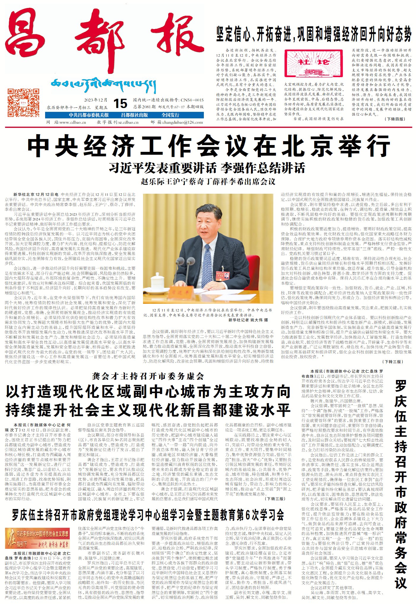 明年經(jīng)濟工作的大政方針已定,鞏固和增強經(jīng)濟回升向好態(tài)勢,持續(xù)推動經(jīng)濟實現(xiàn)質(zhì)的有效提升和量的合理增長,使命在肩、責(zé)任重大。讓我們更加緊密地團結(jié)在以習(xí)近平同志為核心的黨中央周圍,堅持以習(xí)近平新時代中國特色社會主義思想為指導(dǎo),深刻領(lǐng)悟“兩個確立”的決定性意義,增強“四個意識”、堅定“四個自信”、做到“兩個維護”,堅定信心、開拓奮進,努力實現(xiàn)經(jīng)濟社會發(fā)展各項目標任務(wù),以高質(zhì)量發(fā)展的實際行動和成效,為以中國式現(xiàn)代化全面推進強國建設(shè)、民族復(fù)興偉業(yè)作出新的更大貢獻。